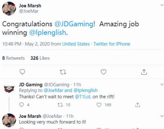 既然LCK派出了自己的冠军战队,那我们LPL自然也是如此。最终在LPL的决赛上面,JDG战胜了TES拿下了赛区的冠军。这也让无数的小伙伴们都非常开心呀。T1的老板也前来恭喜JDG夺冠。不过JDG却开始回应:“谢谢,已经迫不及待的想要和T1交手了”!