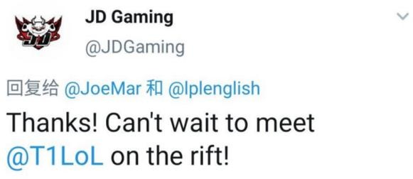 有意思的地方在于,JDG立马就接受了T1老板的邀请,并且表示:已经等不及和你们在峡谷一决高下了!