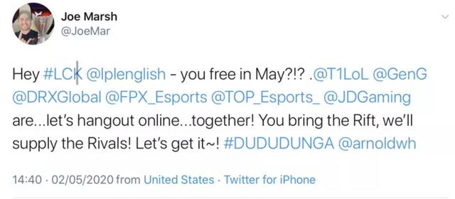 很明显,各大顶尖战队也不愿意就这么平淡地度过休赛期。就在最近,LCK的春季赛冠军T1战队老板,就在外网的社交平台上艾特了LPL三大顶级战队JDG、TES、FPX:你们五月份有空么?我们来一场线上的“洲际赛”吧!同时,还艾特了LCK的Gen.G、DRX和T1。