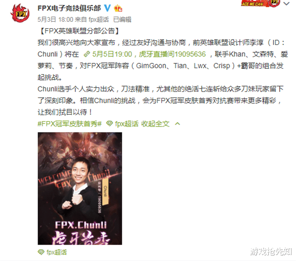 这场FPX冠军对抗赛将会在5月5日进行,所以大家也是多关注队员们的直播间,期待这场精彩的较量把。