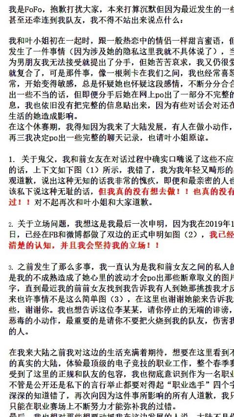时隔几个月后,作为整件事的当事人Fofo终于在那件事情之后首次发声,从Fofo晒出的聊天记录以及声明来看,一共总结了以下几个观点。