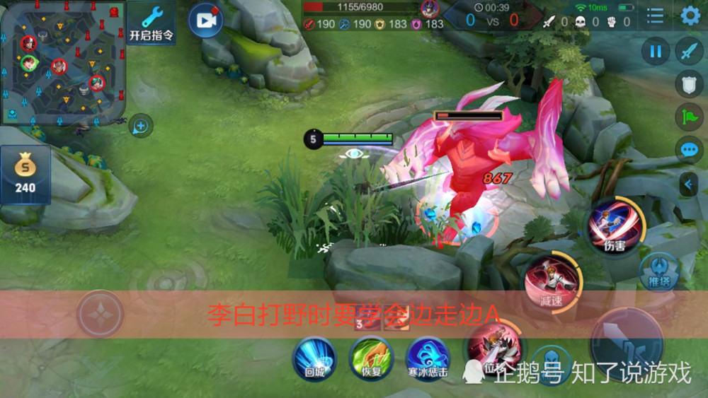 1、知道打野时要边走边A(为什么呢?因为当前李白伤害不高、身板很脆,如果你打野时不学会走A,那么就很容易导致还没刷几个野自己血量就掉了一大半;等第一波野怪全部刷完时,你的李白已经大残,这时你如何去抓人支援,这极大的影响团队发育和自身的节奏。而且走A的好处是:可以减少被野怪攻击的次数避免非必要的掉血,以及还能减少刷出大招后一技能两段赶往战场的距离,且也是利用大招同时刷多个野怪的必备操作);