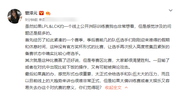 管大上校也是发文表示:虽然说这次表演赛非常想看,但是涉及的问题还挺多的。首先是LPL的选手们刚刚经历了春季赛的大战,需要更多的时间来休息,如果这个时候再次投入到训练中还是比较心疼选手的。而且因为是中韩对抗赛,虽然说名义上是表演赛,但一旦输了随之而来舆论声也是不小等等。