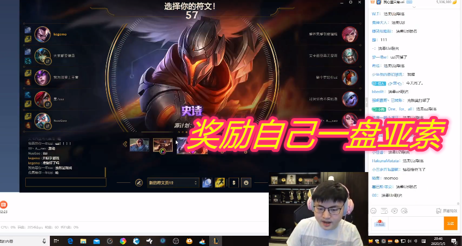 因为是自定义的嚎哭深渊,所以也是全随机的,不过不能够使用色子重新摇一下英雄,小狗随机到了娜美,这自然不符合UZI的玩法,看到队友有亚索,于是小狗至二级交换,便在这一局游戏里,拿到了自己最熟悉的亚索!观众们也都纷纷的调侃:“奖励自己一盘亚索”?