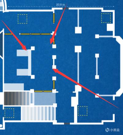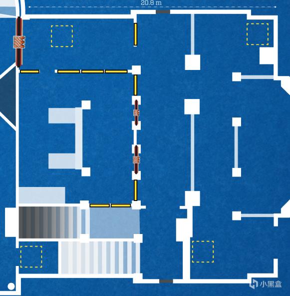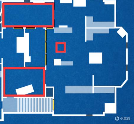 其中水管反向是长走廊,自助餐厅本来就是小门,且同时需要注意楼梯上方和平层。所以讲的简单一点就是——上下点对于进攻方来讲并不是一个适合平层进攻的点位(除非人数差过大)。