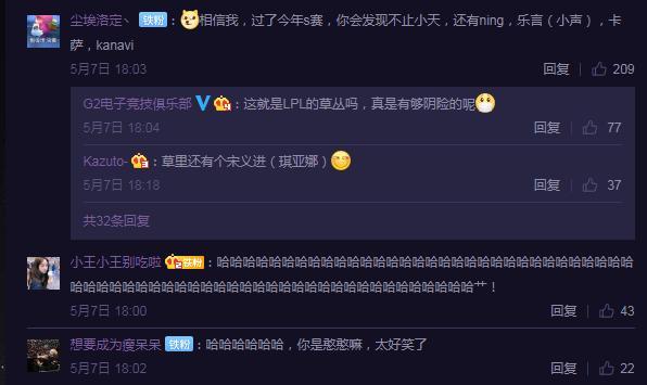 在这条微博下有网友表示:“leyan可是草之子”,“草里还有个宋义进(琪亚娜)”,“G2永远整活滴神”,“什么小天天,那明明是塞少好不好”,“g宝小心,今年lpl有点乱”,“来了来了又到了我最喜欢的消费自己环节”。