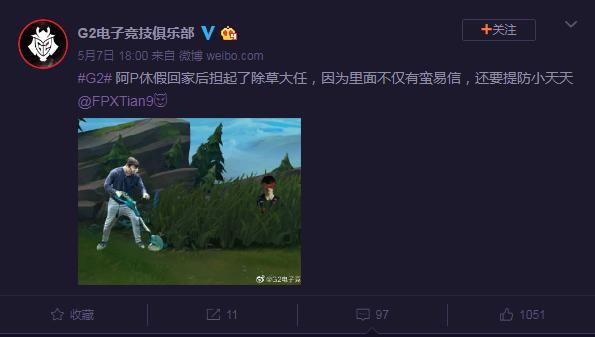G2官博给这张图片配文:“阿P休假回家后担起了除草大任,因为里面不仅有蛮易信,还要提防小天天”。在评论中有一名网友调侃“相信我,过了今年s赛,你会发现不止小天,还有ning,乐言(小声),卡萨,kanavi”,官博回复道:“这就是LPL的草丛吗,真是有够阴险的呢”。