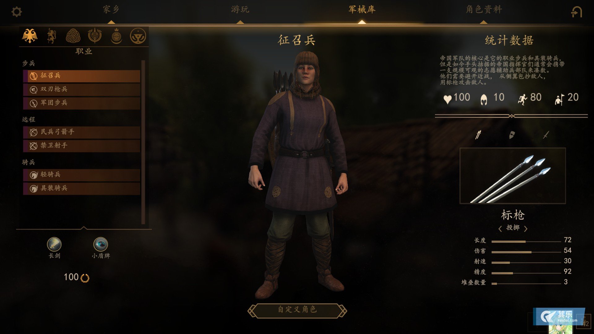 征召兵没有盔甲,唯一有点防护的就是他那厚实的衣服,这些从田里来的20个农民属于“自愿”参军,他们装备稀烂,技术也不行,配个小盾牌能显著提升他们的生存率。如果能抄小路偷袭敌方弓箭手,他的标枪能极快消灭弓箭手的有生力量。不过配上长剑并不能增加多少他们那本就可怜的战斗力,配上长剑是为了增加指挥官,也就是你的个人战斗力。毕竟你虽然贵为指挥官,但装备也是农民水平。