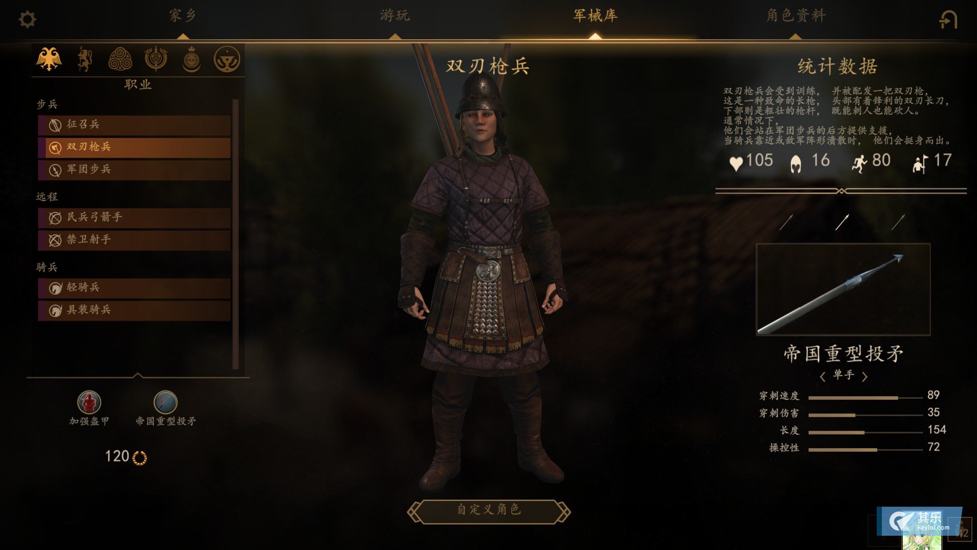 一队人马就是16个军团步兵,而相比之下征召兵一队才20个,性价比差太大了。帝国重型投矛使用方法和双刃枪兵一样,碰上骑兵就当近战长矛用,碰上不带盾的头铁娃,就用投矛白嫖。