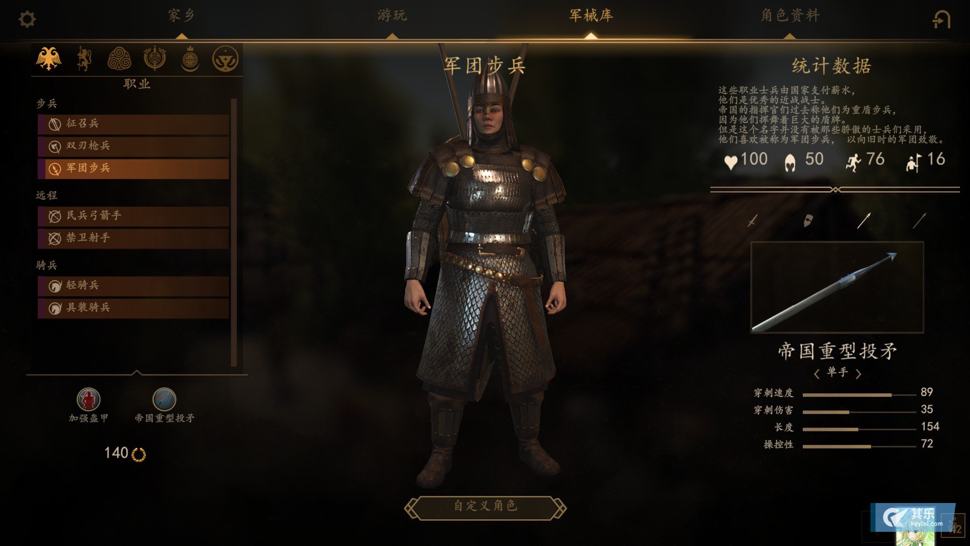 军团步兵建议出装如图所示,加强盔甲+帝国重型投矛。