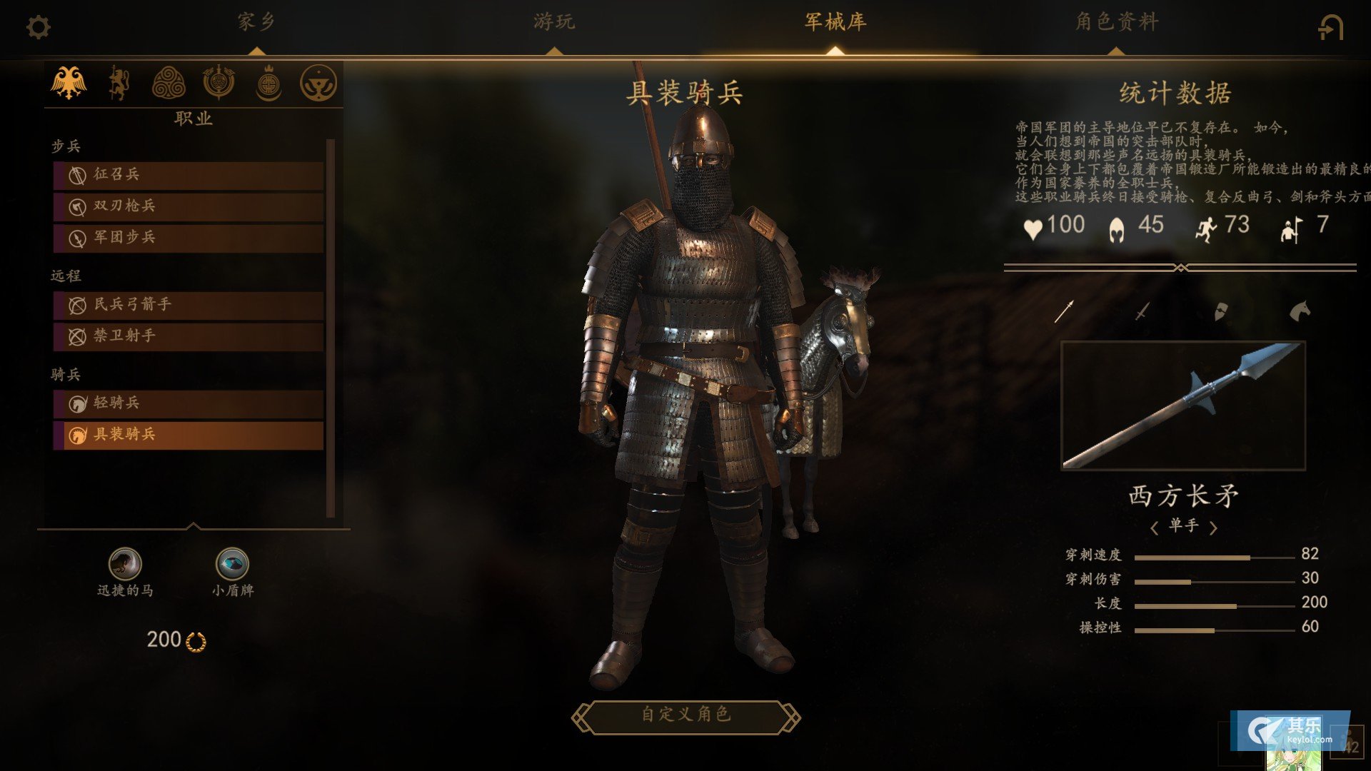 自带马的双刃枪兵,实际战斗力比具装骑兵更强,但防护较低,马没有护甲。