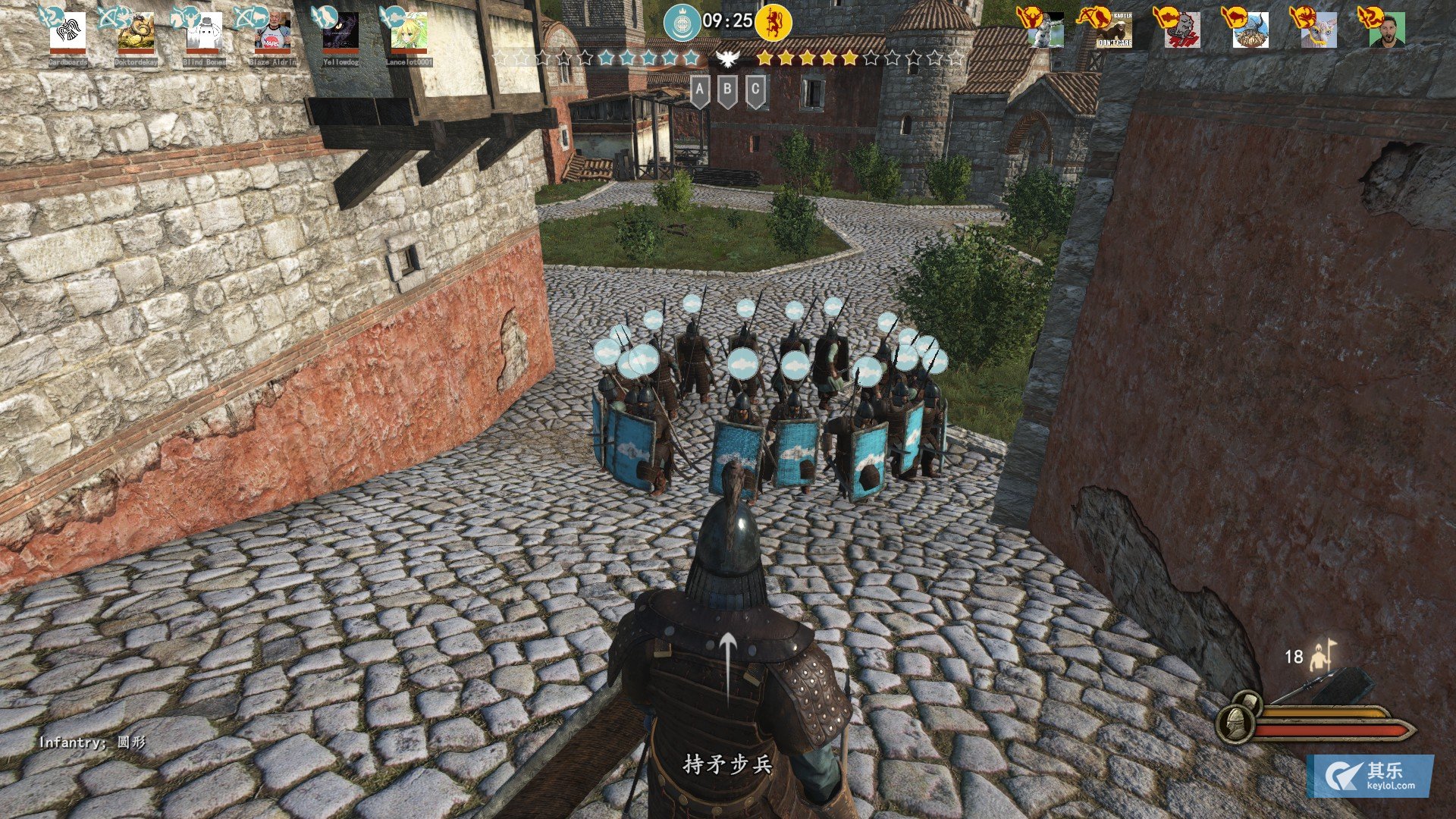 如果碰上已经抢占高地的弓箭手,记得使用盾墙保护你和你的队友。(盾墙功能启用按 F3+F2)混战的时候就不要开盾墙了,直接让他们冲(F1+F3)