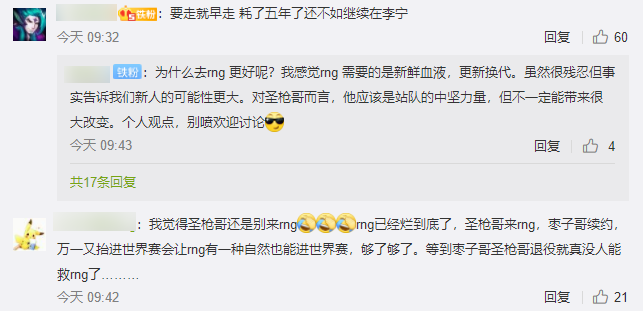 听到圣枪哥还在LNG的消息,网友们立马就开始讨论起来,不少人也认为圣枪哥加盟RNG并不是好的选择,首先RNG现在需要的是新鲜血液,圣枪哥不一定能带来很大改变;其次现在的RNG竞争力并不是很强,他们已经不是LPL的顶级队伍,圣枪哥如果去到RNG没有打出来,那么将面临很大的舆论压力!