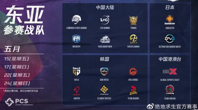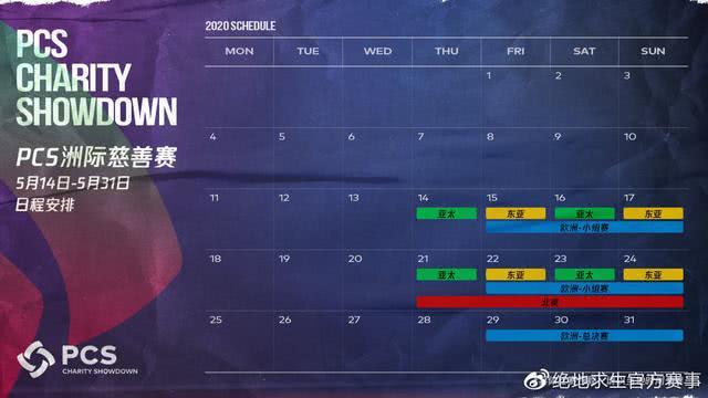 而在黄金大奖赛火热进行的同时,绝地求生PCS慈善赛也公布了最新的宣传片,并且详细的赛程时间也都公布了,PCS东亚慈善赛将在5月15日,17日,22日和24日进行,于每天晚上六点准时开打,目前还不清楚每天几场比赛,但应该是BO6。
