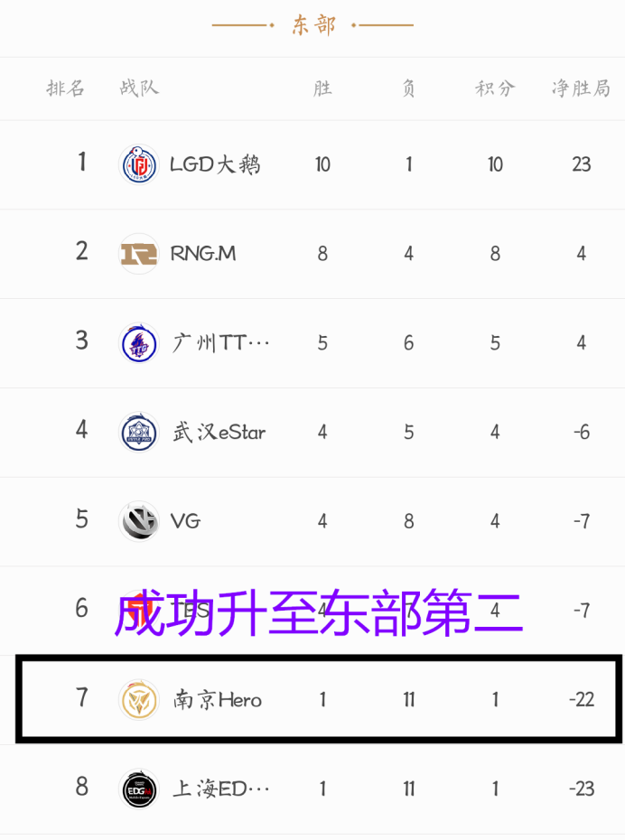 通过这一场胜利,南京Hero成功超越上海EDGM成为东部第二。不至于垫底也不至于赛季全败,这让南京Hero队员们总算是松了一口气。同时他们也保留了晋级季后赛的可能,虽然仅仅是理论上的可能吧,毕竟他们接下来的对手是WE、TS跟LGD大鹅这三支强队。最后希望三冠王能在接下来的休赛期好好的调整好自己,利用最后这三场比赛多找一下自身存在的问题,在秋季赛卷土重来。那么对于南京Hero你还有什么样的期待吗?