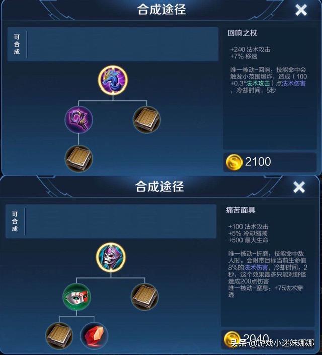 2.法师在痛苦面具和回响之杖的选择上,则以痛苦面具为主。回响之杖+7%的移速,同时技能命中会触发小范围爆炸造成(100+0.3*法术攻击)点法术伤害,利于打脆皮英雄与前期的游走支援。痛苦面具+75法术穿透,技能命中目标能附带目标当前生命值8%的法术伤害,用于打坦克的效果较好,而当下两者一起出的性价比不高,所以大多数阵容以痛苦面具为主。