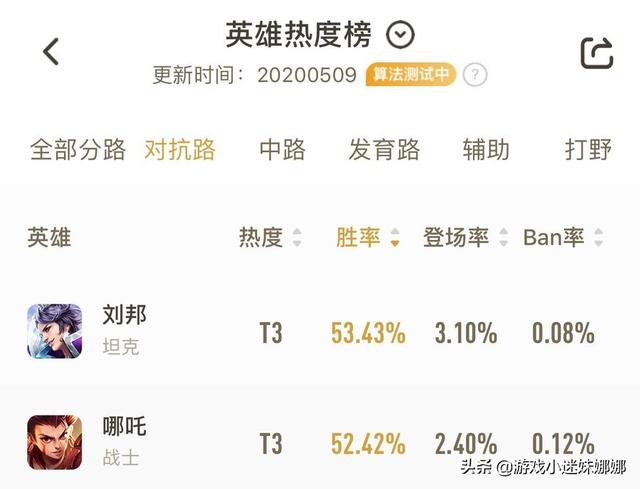 3.利用坦克打坦克也是不错的应对策略,这里非常推荐刘邦,因为刘邦的大招能够迅速支援队友,形成多打少的局面,即使晚清兵,也能比敌方对线坦克早到战场,何况刘邦打大部分坦克,线上不会被压制,目前刘邦在游戏中的表现也非常亮眼,53.43%的胜率排行对抗路第一,全英雄第三。
