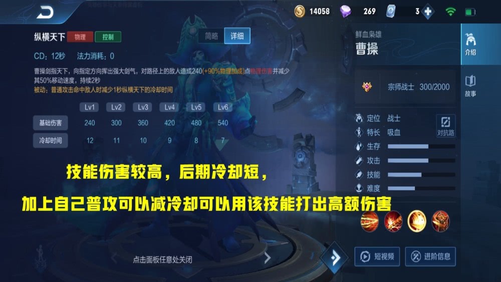 1.技能和普攻可以用来相互抵消抬手动作!曹操的被动可以说是很好的为他提供了刷野的帮助,每次施法提供的百分之十的攻速让曹操能够在前期更快的刷完野,同时曹操的所有技能和普攻的抬手动作都是可以被其他的技能或者普攻来取消的,在自己的技能或者普攻之间可以快速穿插其他技能可以很好的把自己的大招发挥出最大的作用,从而让自己在刷野以及和抓人的时候都有着不错的作战能力!