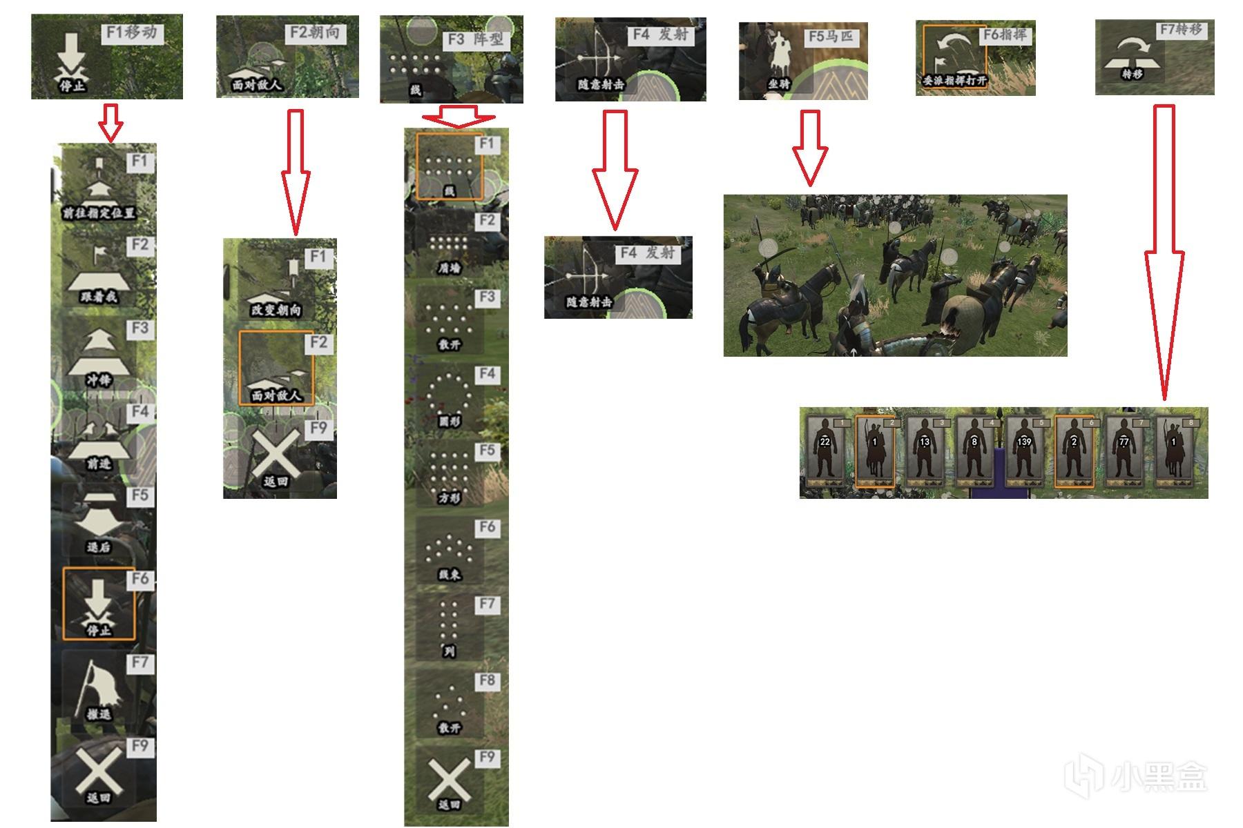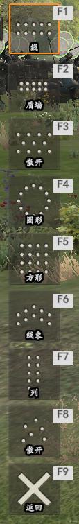 F3为阵型 输出指令F3+ F1 ——线、 F2——盾墙、 F3——散开 【直线有阵型的】、 F4——圆形、 F5——方形、 F6——线束、 F7——列、 F8——散开【无阵型杂乱的】 F9 返回