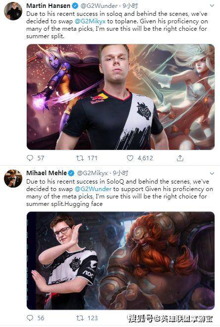 前段时间,阿P和Caps宣布再次摇摆互换位置,这还不够,今天上单Wunder和辅助Mikyx也来了,他们也发推特表示将在夏季赛互换位置!