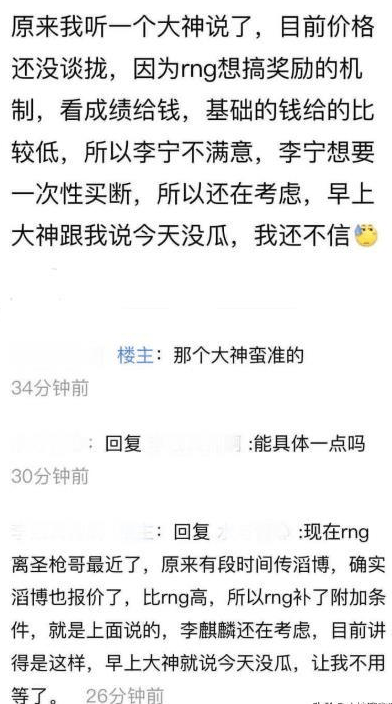另外,RNG出现新人试训的同时,网上有人爆料圣枪哥转会RNG又双叒叕出幺蛾子,该网友表示: