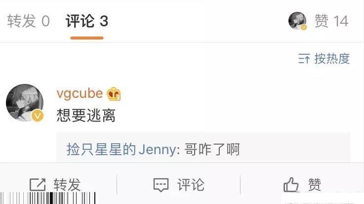 他就是VG的上单cube。Cube在春季赛表现出色,不少LPL观众都认为他是一个有潜力的国产上单,可以称之为未来之星。不过cube也在Noble这条微博下方留言了,他也说了类似的话,cube评论表示:想要逃离。这条评论现在已经被删除了。