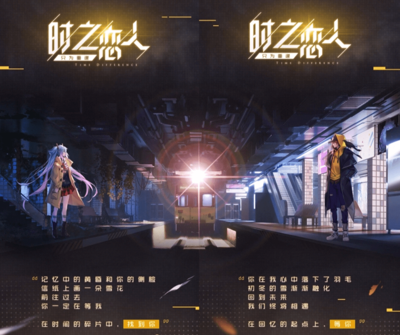 在官方公布的原画中,他们两个分别站在地铁站的两侧,中间的地铁缓缓驶来,意境非常好,有点像电影《你的名字》中的场景。