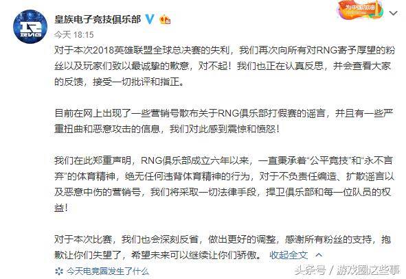 我们在此郑重声明,RNG俱乐部成立六年以来,一直秉承着“公平竞技”和“永不言弃”的体育精神,绝无任何违背体育精神的行为,对于不负责任编造、扩散谣言以及恶意中伤的营销号,我们将采取一切法律手段,捍卫俱乐部和每一位队员的权益!