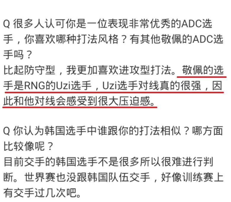 采访中,记者询问LWX:你是否有非常敬佩的ADC选手?LWX回答:自己很喜欢进攻型打法,所以最敬佩的选手就是RNG的UZI,因为UZI的对线能力非常强,和他对线的压力很大。