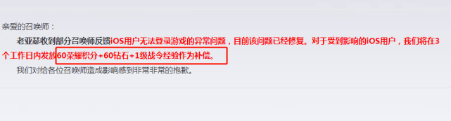 说完了刘备的优化,在说一下近日IOS用户遇到的另外一个小插曲吧,也就在近日身边的苹果玩家都向我吐槽到游戏登陆出现了异常,登陆卡顿甚至有的直接就登不上,对于这点也是在22号这次不停机更新中优化了一下,现在大家也都能正常游戏了,不过由于影响的用户挺多的,天美也是放出了超豪华的补充邮件:60荣耀积分+60钻石和1级的战令经验,要知道60荣耀积分是什么概念,等于是人均可以白P一次荣耀夺宝了,也是让安卓的玩家相当的羡慕。
