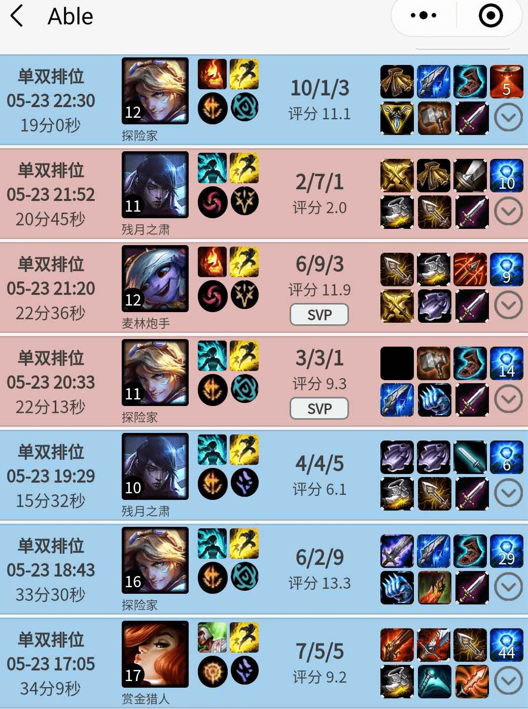 以大家对Able的印象来看,他是绝对不可能打到这个分数的,因为劣势就乱玩,怎么可能上分?但实际是,走A怪已经变了。他最新的韩服Rank战绩如下图所示,总的来说输的少赢的多,而且输得局也很少看见那种死亡十几次的战绩了,反而还有很多SVP,尽力局不少,也许是之前的一些风评,又或者是战队的教练有跟他谈话,他现在确实没有之前那么反骨了。