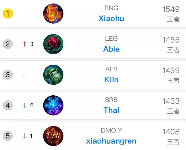 截止到5月24日零点的韩服Rank战绩如下图所示,韩服第一还是小虎,王者1549分,第二名就是Able,目前是王者1455分,第三名是AF的上单Kiin,第四名是之前的韩服第一T皇,第五名是DMO二队的打野。
