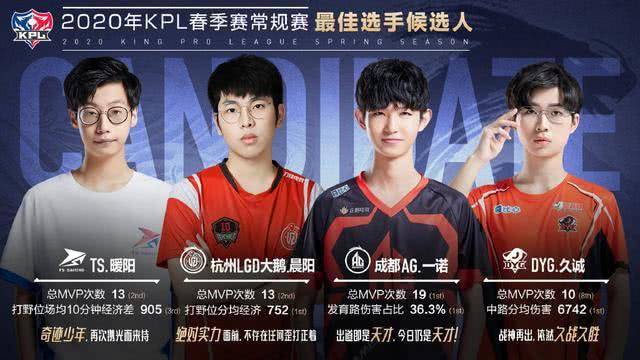 2020KPL春季赛常规赛已经落幕,季后赛的比赛在本周就将正式开始。而常规赛最佳选手一直是大家关注的焦点,候选人已经新鲜出炉。和以往不同的是,本赛季总共有四人入选,争夺最终的一个名额,相比于之前要更加激烈,一起来看一下吧。