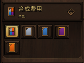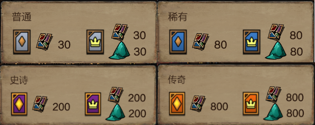 在合成费用这一栏可以看到各种稀有度卡牌的花费,左为普卡,右为闪卡,用王冠来表示。尚未拥有,但有足够资源合成的单卡左下角有个锤子的符号,代表可以合成。