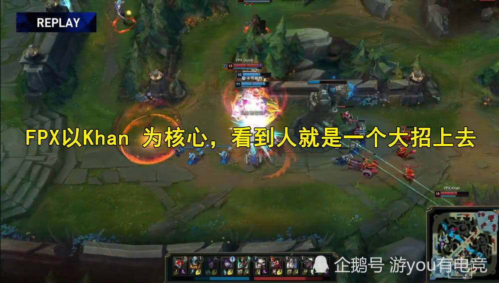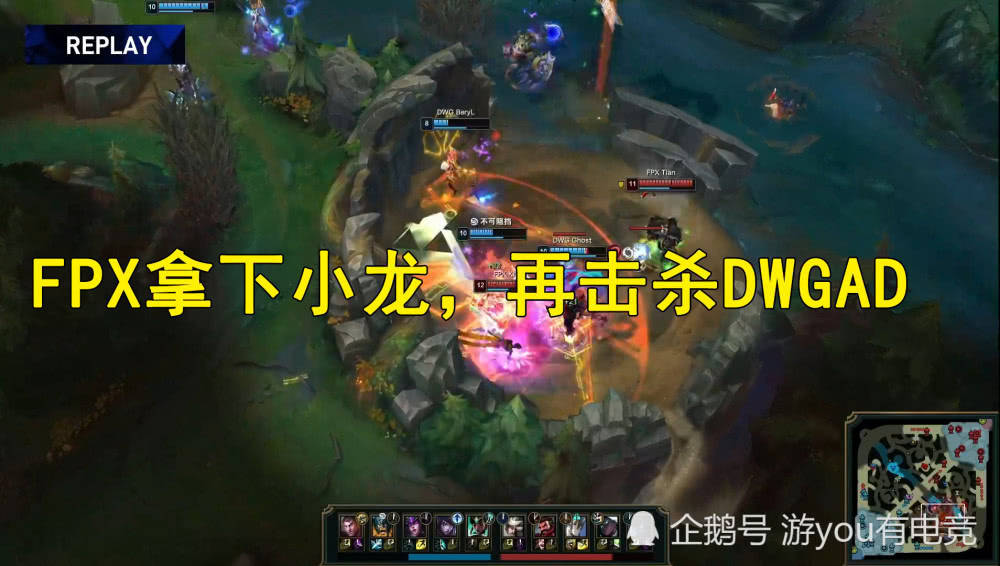 在这之后,DWG和FPX开始围绕地图资源进行争夺,小龙中,FPX多人去包夹,DWG只能后退,Doinb开始了自己的打团风格,开启W上去嘲讽到多人,成功的把DWG打退,拿下了小龙,接下来,FPX开始围绕Khan的单带来进行处理,只要看到人,Doinb的大招就会跟上,配合到塞娜的大招打出控制链的伤害,这波直接把DWG的下路二塔推掉!