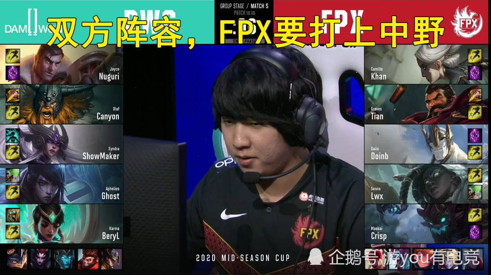FPX战队在阵容的选择上面中,选择了青钢影、男枪、加里奥、塞娜、大树的体系,DWG战队则是选择了杰斯、奥拉夫、辛德拉、厄菲流斯、卡尔玛的阵容,FPX更加的偏向打上中野的组合,下路偏向发育,这是阵容所决定的,DWG则是要把对线给拉满,上中下全部都是选择的强势对线玩法,这里需要注意的是,刘青松选择的大树,带了TP!