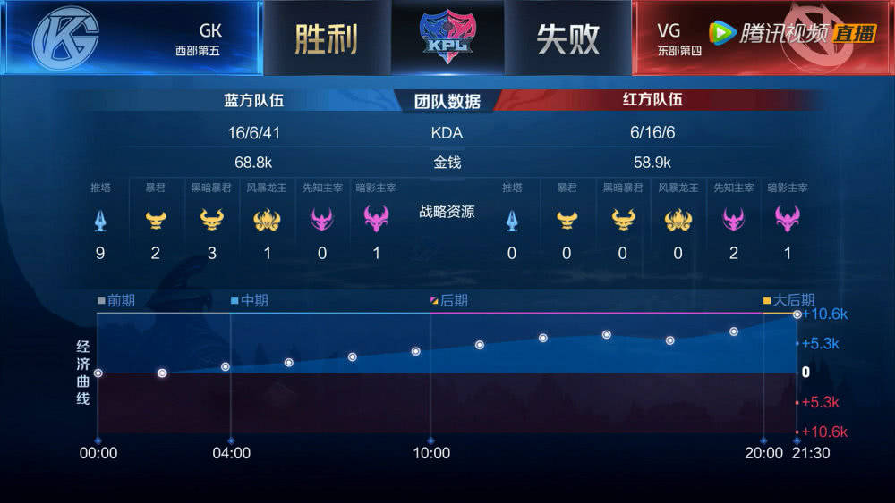 双方前期换龙,GK三人集结上路击杀马超拿下一血,先破上路外塔中路青枫王昭君冻住多人,阿改兰陵王补足伤害斩获三杀,GK破掉三路外塔,开始入侵野区滚经济。中路VG突然发难秒掉公孙离,双方二换二,VG迅速拿下黑暴,击杀兰陵王后再拿主宰,吹响反攻号角。GK通过兵线运营拖住节奏,下路一换二后直破VG中高地。但VG击杀大乔后拿下主宰,一波团灭GK,拿下最终胜利!