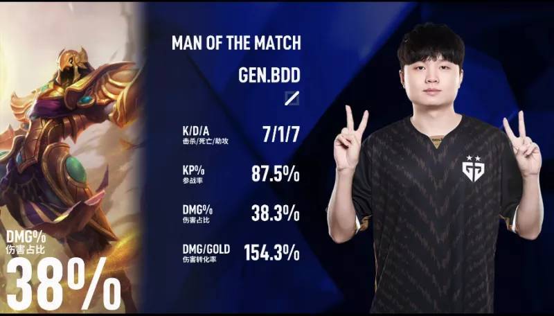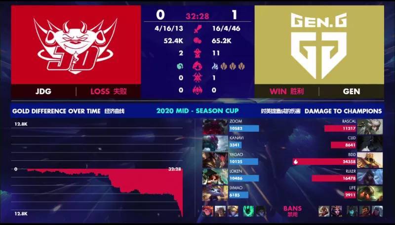 JDG拿到的是前期很强势的中野组合卡牌和巨魔,结果一直表现很稳定的JDG却在本次比赛中因为过于激进而被GEN找到机会,比赛开始3分钟由于JDG深追沙皇将闪现都交,结果GEN上单青钢影TP赶到,帮助GEN中野逃跑的同时击杀牙膏,10分的时候巨魔回城被GEN抓,GEN三人包夹将巨魔击杀。在接下来的几波团战中,由于JDG阵容的原因,JDG被打出了好几次小团灭,双方经济差距拉开。最后由于GEN快速rush大龙,一波带走比赛!