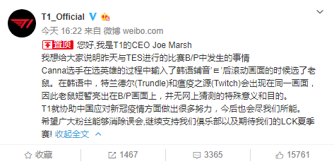 在事情闹大之后,T1俱乐部也坐不住了,发表微博回应:Canna是由于手滑点错了,并没有网上猜测的特殊意义和目的。