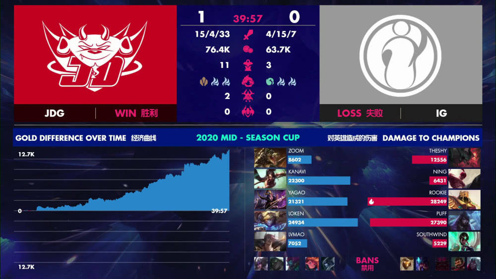 这局比赛从一开始IG就输了,野区基本都是失守的状态,豹女全图吃野区资源,最高领先盲僧4级,JDG也不慌不忙,慢慢吃小龙和大龙慢慢磨死了IG,IG这局最大的短板就是上野了;IG输掉了这局比赛之后,仅剩理论出线可能,下一场打Gen一定要赢,然后最后一局DRX赢下JDG,三个1-2进行加赛,3支队伍进一个,总之来说IG的命运已经交代在别人手里了。