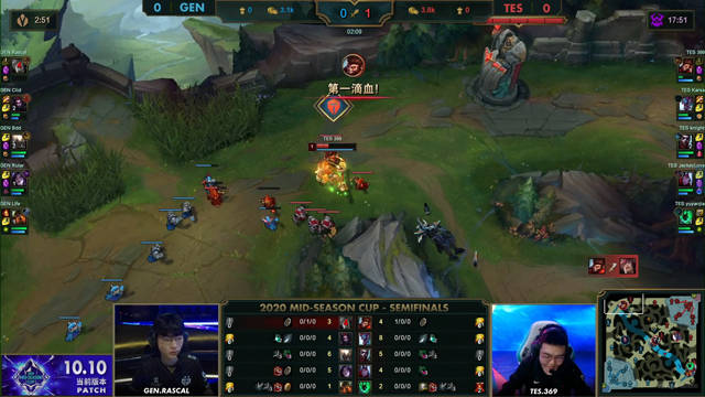由于第一场是盲选模式,双方的英雄都是选出自己擅长的英雄。GEN选出了上的那腕豪,打野蜘蛛,中单潘森,下路卡莎和泰坦组合;TES拿出了上单猴子,打野巨魔,中单艾克,下路韦鲁斯和锤石组合。