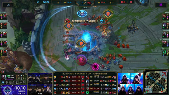 21分钟,TES五人抱团推进上路,击杀GEN中上后,轻松将GEN上下水晶推毁,经济领先1W多!最后一波,TES将GEN三路全破后直接一波结束比赛,心疼一波阿水,GEN在最后一波结束之前,死也要将阿水击杀,可以说是非常真实了!恭喜TES拿下首场比赛胜利!最后,喜欢观看季中杯的玩家别忘了去虎牙观看哦,除了蓝光高清外,还会有二路解说供玩家观赛,届时Mlxg和Letme都会现身哦!