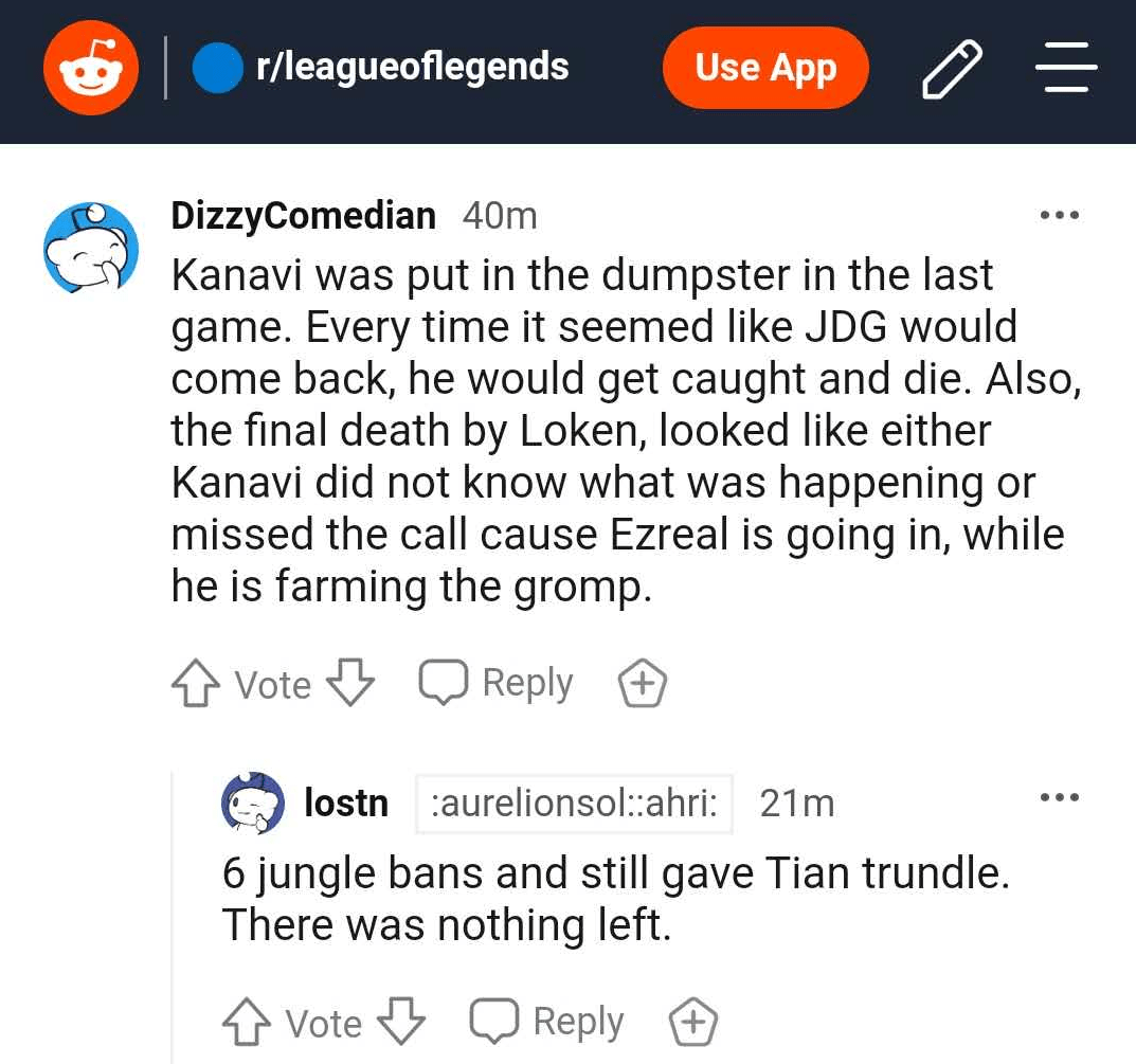 -Kanavi在上一场比赛中表现太垃圾了。每次看起来JDG要打回来了,他总是会被抓死。当然最后其他人都在发育的时候,loken也被击杀了,看起来kanavi似乎不知道发生了什么,并且忘记了EZ也在的事情。