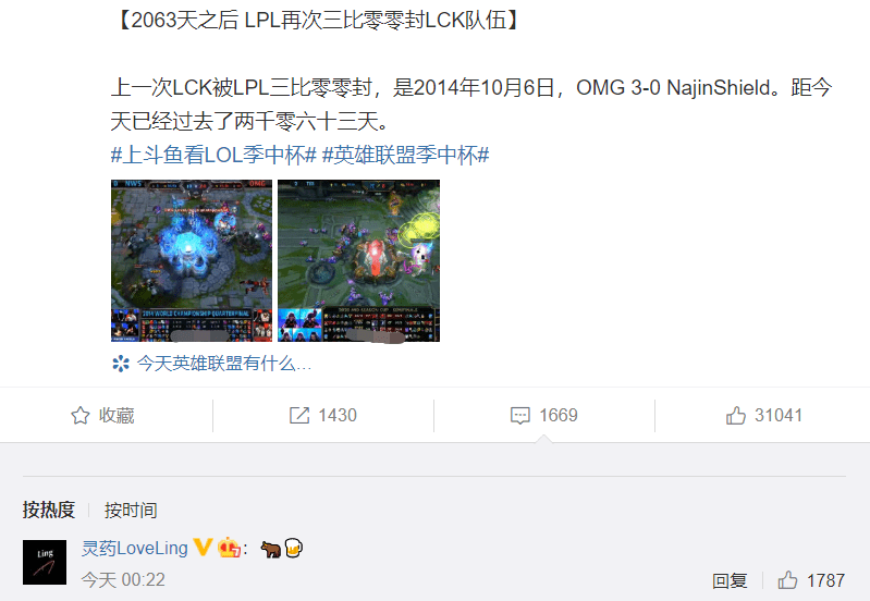 TES横扫LCK豪门GEN,与FPX会师决赛还有着别样的意义,据悉这是时隔2000多天之后,LPL战队再一次横扫LCK战队,上一次出现这种情况,还得追溯到S4赛季英雄联盟全球总决赛,当时黑暗势力OMG与韩国劲旅白盾交锋,凭借Gogoing、良小伞、军师灵药等人的出色发挥,OMG轻松横扫白盾晋级下一轮,如今全华班TES再度横扫韩国劲旅,怎能不让人激动?值得一提的是,我们在评论区看到了一个久违的名字,他就是前OMG核心野王灵药LoveLing。