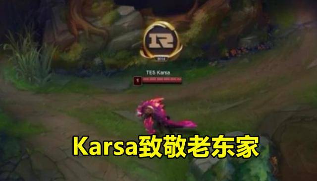 在系列赛第二场比赛伊始,TES选手Karsa突然秀起了队标。他先是亮出了自己在LMS赛区的老东家FW闪电狼,随后又突然亮起了RNG的队标。致敬老东家的同时,似乎也有种二次元动漫里的中二风——队友们的意志由我Karsa来继承!