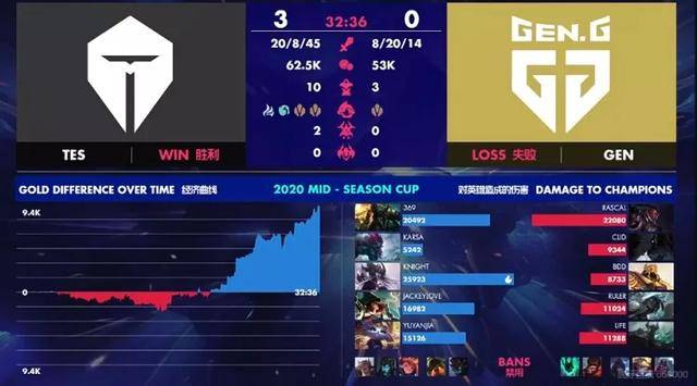GENG作为LCK春季赛的亚军,也是本届季中杯剩下的唯一一支LCK队伍,可谓来势汹汹。赛前不少网友也认为这会是一轮天雷地火的对决。然而仅用三场比赛,TES就结束了这轮系列赛,双方总计击杀比为67-19。TES的击杀数比GENG高出三倍还多!而且每场比赛用时都很短,完全就是开着坦克一路碾过去的既视感。
