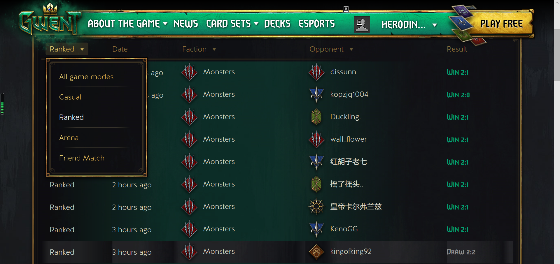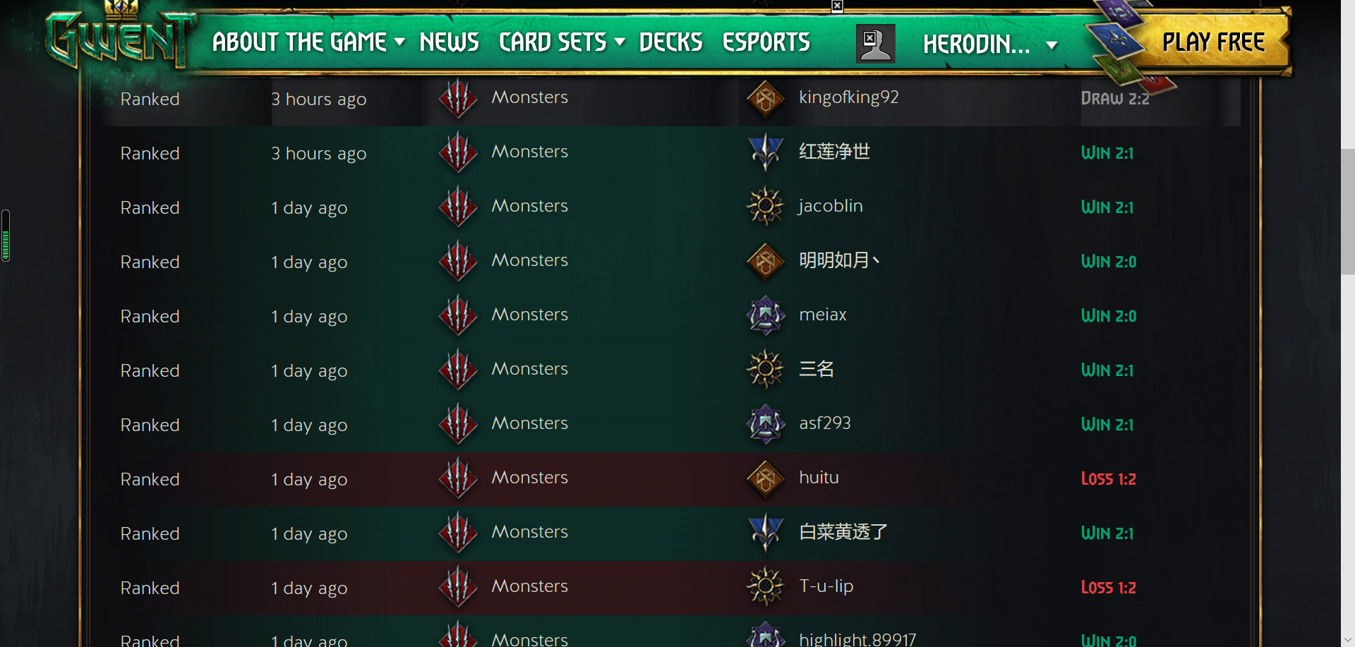 对局的核心思路就是,留好手牌,拿下r1,r2逼牌,r3 3张牌,然后胜利。当然话是这么说,可能有的读者就会说了:哎呀ODIN啊,照你这么说,要是r1没能拿下怎么办啊。(没人这么说啊,那没事了)其实这个问题我也非常能理解,重所周知,蟹蜘蛛后手t0先手t4,你若是r1后手,在怎么滴,至少打一个亏一卡赢没有问题。但若是r1先手,处理不好甚至可能被平卡,非常的没有牌面。这里教会大家一个非常有用的小技巧,就是洗脸(不是)。其实这个版本中,怪兽的先手能力还是可以的,天敌辛迪加的热度已经下去了很多(数据由月报统计数据可知)。北方基本对于你的一众大点数毫无办法,帝国如果带毒可能好一些,不带毒的话就是一个符咒收蜈蚣。松鼠的话,算好他毒的数量以及精灵的数量(防止对面拉爱黎瑞恩爆点跑)。怪兽基本就是吸血鬼,他点数大不赢你的,如果对面4虫可以考虑直接污水怪或者用狂猎战士以及适者生存解决,百试百灵。群岛的话也不是很怕,你的点数多是绿字,不吃对面野猪,算好对面一张莫克瓦格:恐惧之心就行,同时可以直接热浪对面双刃。辛迪加的话,就是尽量延迟你上蜈蚣的时间节点,前几手尽量用小点数混,对面下花钱第一时间解掉,对面会非常难受。其实说到底,细节也就是在于上蜈蚣的时间,以及什么牌该解什么牌不用管,总之打起来还是非常灵活的,不存在什么卡手,基本所有卡都可以交,不像剧情卡组啊,战灵卡组啊,就像一坨淤泥,非常的僵硬。r1拿下以后,就是逼牌了,个人意见是一定要逼,而且尽量不要亏卡。这就是一个非常讲究的活计了,我20把里面只有一把对战时r2逼牌亏了卡(但是最后还是赢了)。其实不亏卡这个说法是不准确的,如果能铜换金,大胆去换,尤其是对面核心金卡(根据著名昆特视频作者海带鸽某次角斗场视频所言:没有点数支撑的卡差是无用的)。别看你这都是铜卡,实际上点数都很大,因为你的被动,你的4p卡至少都有5p,战意激升更是离谱。总之,因为是控制卡组,所以你得对于你对手所用的阵营都有一定程度的了解,知道什么时候该跑了(这样一看好像对于萌新不是那么的友好...)但是这不重要,如果你是一个萌新,你可以通过这套卡组来理解其他的卡组的胜点,这样你在玩其他卡组时上手会更加的快,这么一想,我还真是个带善人。然后r3用,欧兹瑞尔,大锤等一系列恶人让对面知道什么是残忍。如果对面由大点数针对卡,就晚点上大的,先上小的,能空场(打特殊牌)就优先控场。著名昆特整活大师——0甲蜈蚣,盲狙撕裂,亏卡赢牌,CN昆特的拯救者咖喱garigari曾言:空场昆特,best 昆特。在下深以为然。