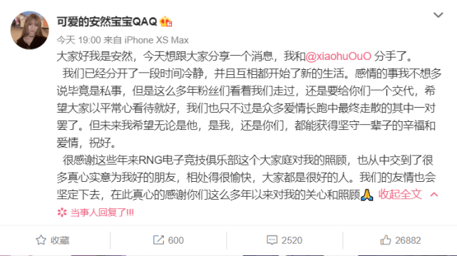 相信大家都知道,在2018春季赛的时候,RNG战队的太太团横空出世,那时候似乎是有一种神奇的力量,加上版本也正好是下路的版本,所以全队起飞,直接是在那年取得了非常好的成绩!当时大家对这个太太团可以说是非常关注,再看一下当年嫂子团的自拍视角,转眼都是两年了,如今已经是物是人非。当年RNG的队员姿态、Mlxg、Letme都已经退役,而Uzi直到现在也不知道到底是复出还是退役,毕竟现在夏季赛已经马上开始了,RNG公布的首发阵容里面没有Uzi。而且在这个RNG太太团,也基本是散的散走的走。在6月1日这一天小虎的女友安然发微博,称两人已经分手了!