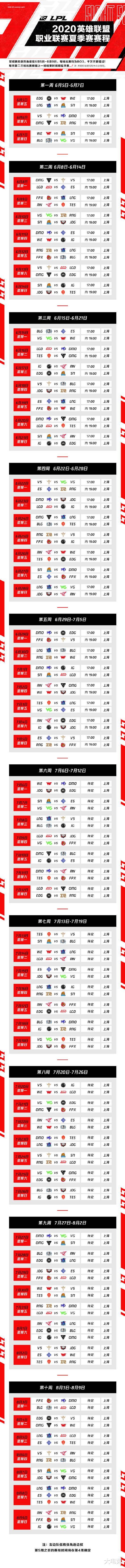 北京时间6月2日,英雄联盟赛事官方公布了LPL夏季赛的赛程安排,夏季赛将于北京时间6月5日开赛,8月9日结束,共计10个比赛周,两场BO3贯穿每周7天!第9、10周的周六、日则有三场BO3等待着大家,每天第二、三场比赛根据上一场结束时间顺延开赛。6月5日(周五)下午17:00的揭幕战为EDG对阵WE,第二场由LNG直面SN。
