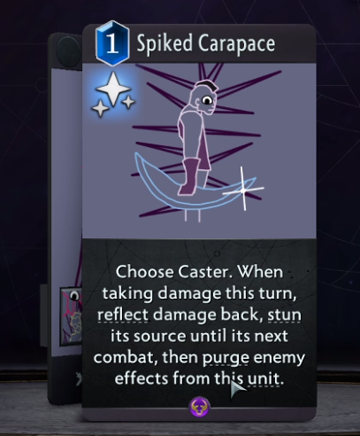 【尖刺外壳】选择施法者。本回合当其受伤时,反弹该伤害,眩晕伤害来源直到其下次战斗,从该单位上净化所有敌方效果。